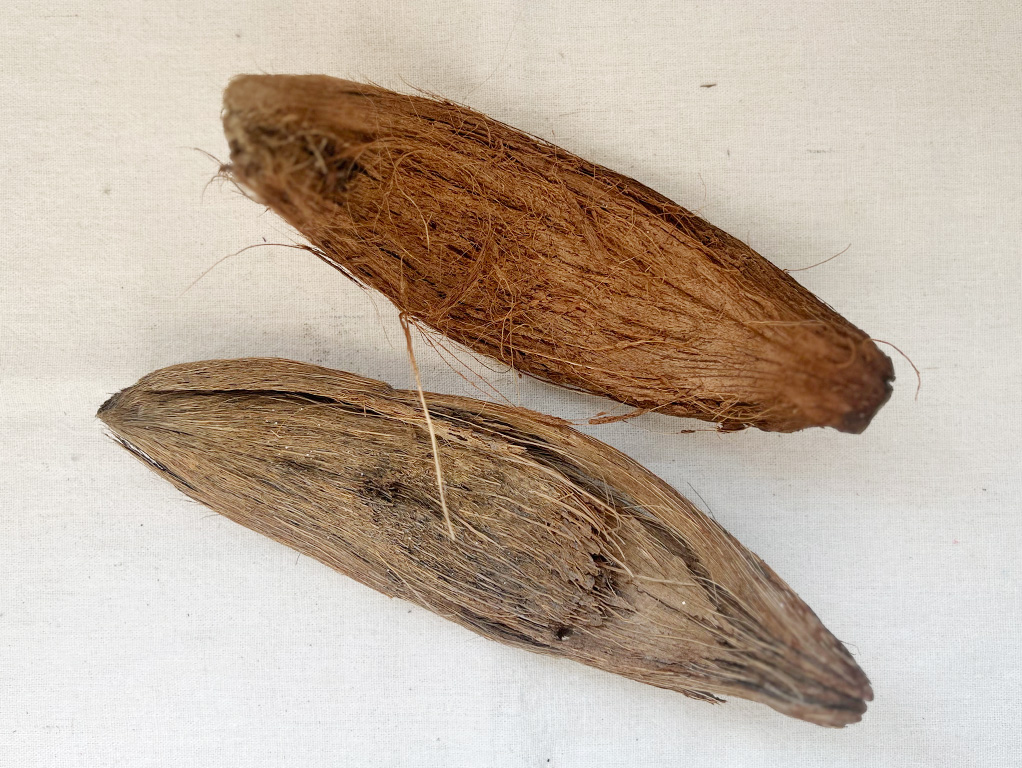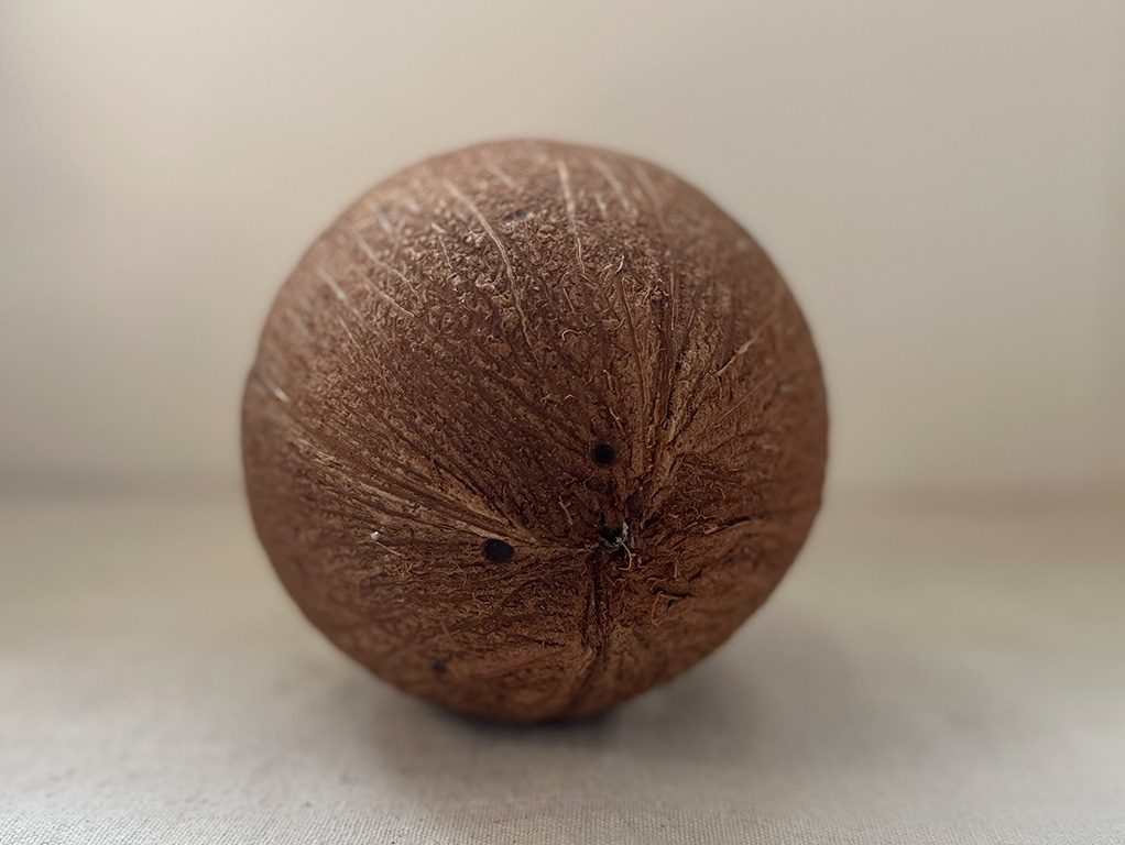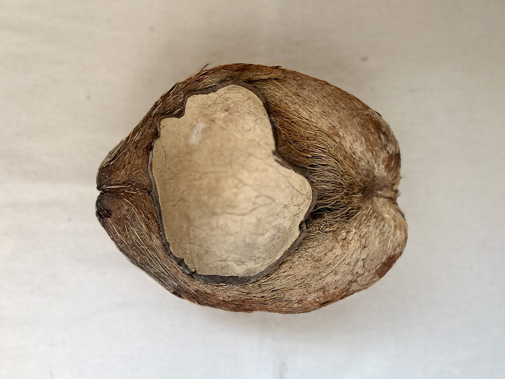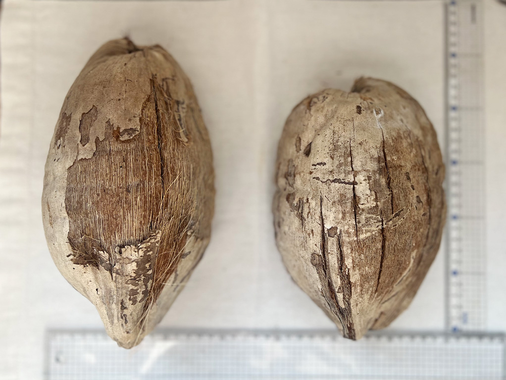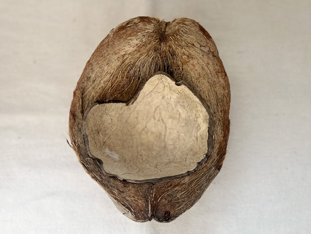 ココナッツは、探せば見つけるのはそう難しくはありませんが、どうしても割れていたり、穴が空いていたりして完全な状態「完品(かんぴん)」で見つかることはなかなかありません。きっと、黒潮に乗って旅をする間、色々ものにぶつかったり、あちこちに流されたりしたんだな。と思うとロマンを感じます。